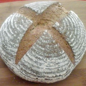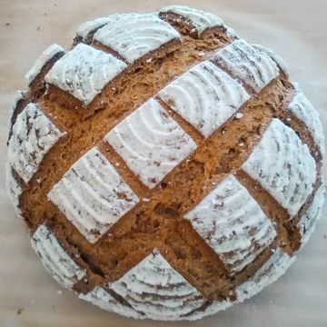 Farmers Bread. Artisan German style bread made with a mix of rye and wheat flours. Carraway (seeds or ground) can be added if desired.
