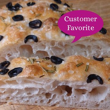 This artisan, rustic Italian Focaccia bread is topped with coarse sea salt, rosemary and olive slices. Made with authentic Italian 00 flour it takes about 2-3 days to make this bread. It's crumb is coarse, fluffy, juicy and flavorful with a thin crust.