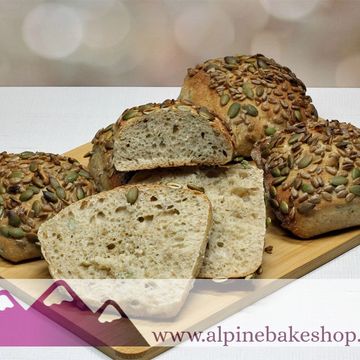 Rustic Mountain Bread - This rustic aromatic bread is made with a mix of wheat, rye and whole spelt or whole white wheat flours. Bread spices are usually added but can be omitted by request.