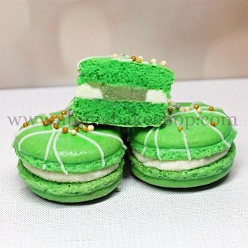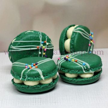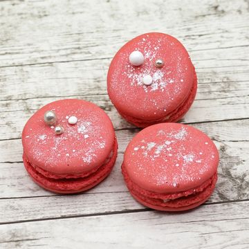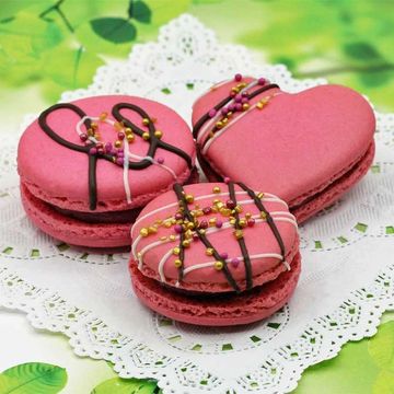 The filling is a delicious, fruity raspberry ganache that melts in your mouth. The color of the macaron is red to coordinate with the flavor. You will receive round shaped macarons. Shaped macarons are available at additional cost.