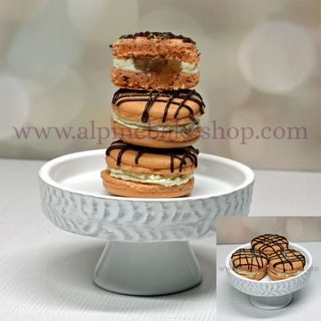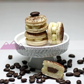 Inspired by the Italian classic! These macarons have a hidden coffee ganache center enhanced with savoiardo biscotti and encased in a velvety white chocolate - mascarpone ganache. The color of the macaron is off white/beige and dusted with cocoa powder to coordinate with the flavor. A chocolate cocoa bean will be added to half of the macarons in the set.