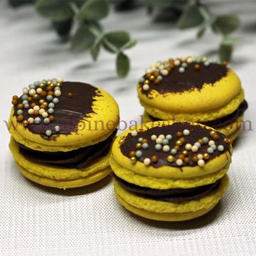 A smooth, velvety banana chocolate ganache with a hint of caramel to make it perfect. These macarons are to-die-for delicious. The macarons are banana-yellow.