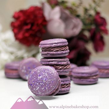 The distinctive and elegant black currant flavor is emphasized by the combination of Belgian ruby chocolate and black currant jelly. These purple colored macarons show a silver and purple sprinkled top.