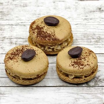 These macarons are filled with a delicious espresso ganache that melts in your mouth. The macaron shells are coffee flavored. Decorated with a chocolate coffee bean and cocoa dust (it is NOT a real coffee bean, it's coffee flavored chocolate). The color of the macaron is light brown to coordinate with the flavor.