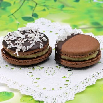A delicious toasted coconut fudge between cocoa flavored macaron shells. The macarons are dipped in Belgian semi-sweet chocolate and sprinkled with coconut flakes. The color of the macaron is brown to coordinate with the flavor.