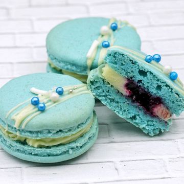 The filling of the Blueberry Macarons is a combination of a coconut ganache and blueberry fruit filling. The color of the macaron is blue to coordinate with the flavor.