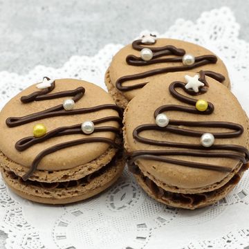The filling of these Christmassy macarons is a gingerbread flavored milk chocolate ganache and orange jam. The color of the macaron is brown.