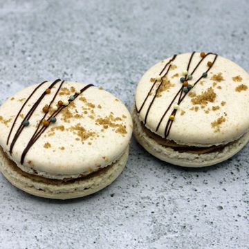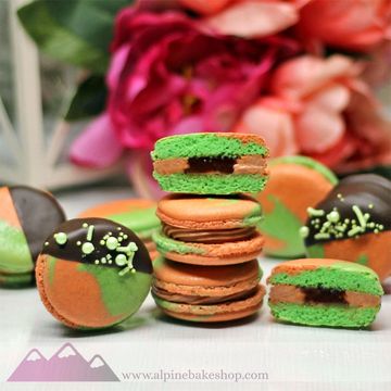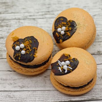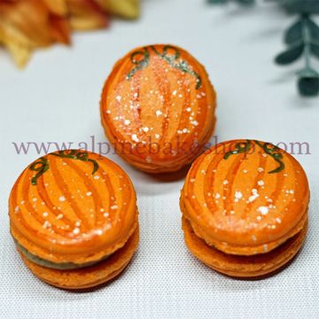 Bursting with fall flavors, these macarons have an irresistible pumpkin spice latte ganache filling. The macarons are orange in color with a pumpkin painting.