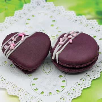 These macarons are filled with a luxurious champagne ganache and black currant jam in the middle. The color of the macaron is deep purple to coordinate with the flavor. You will receive round shaped macarons. Shaped macarons are available at additional cost.