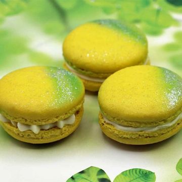 The filling is a delicious, fruity lemon ganache that melts in your mouth. The color of the macaron is yellow to coordinate with the flavor.