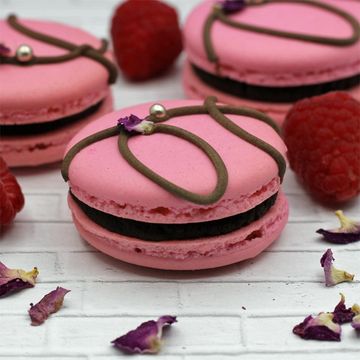 The filling of these Chocolate Raspberry Macarons is a combination of dark chocolate ganache and a tart raspberry fruit filling. The color of the macaron is pink to coordinate with the flavor.