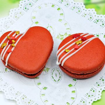 The filling is a delicious, fruity strawberry ganache that melts in your mouth. The color of the macaron is red to coordinate with the flavor. You will receive round shaped macarons. Shaped macarons are available at additional cost.