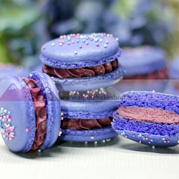 The bursting flavor of sweet Summer berries combined in a velvety white chocolate ganache. The color of the macaron is violet-blue to coordinate with the flavor.
