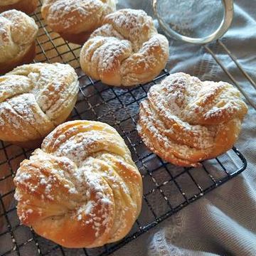 Merge a French croissant with an American muffin and voila there's the Cruffin. A buttery flaky croissant like pastry in the shape of a muffin. Dusted with powdered sugar or cinnamon sugar. Our version is plain and not filled.