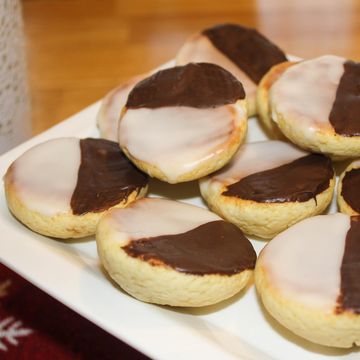 Black & white cookies. These small, soft, cake-like cookies with a chocolate and lemon glaze are a common pastry in German bakeries and loved by children and adults alike.