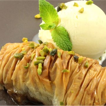 This exquisite and luxurious Turkish dessert is made from layers of gauzy, buttery, rolled filo dough sheets. They are filled with walnuts baked until crispy and then drenched with a flavored sugar syrup and sprinkled with ground pistachios.