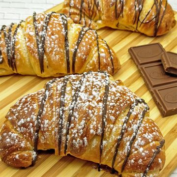 Buttery flaky crescents filled with chocolate pieces and decorated with chocolate and powdered sugar.