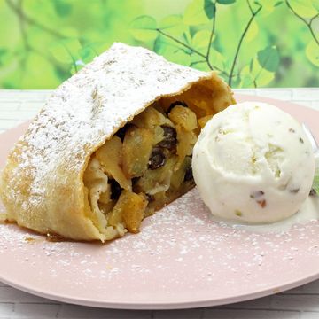 Apple Strudel is a popular pastry in Bavaria, Austria, South Tyrol and also Czech Republic but it originated in Vienna, Austria in the 17th century. Spiced apples and juicy raisins rolled into a sugar powder dusted flaky crust. Serve it with a vanilla custard sauce, vanilla ice-cream or Chantilly cream (sweetened whipped cream). Contains rum, can be omitted.