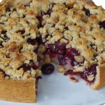 Cherry Cake with Crumbs. Large, sweet and juicy cherries nestling in vanilla cake that's infused with just a hint of orange and sprinkled with clusters of buttery crumbs. It's a classic straight out of Oma's cookbook!