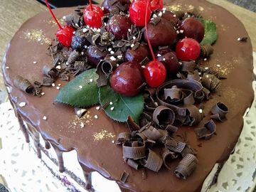 This rich and moist yet fluffy Chocolate Cherry Cake is filled with juicy cherries and coated with a delicious semi-sweet chocolate-ganache glaze. Decorated with Dutch chocolate sprinkles and chocolate dipped maraschino cherries.